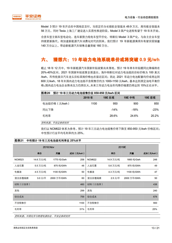 猜想六:19年動力電池系統(tǒng)單價或?qū)⑼黄?.9元/wh。2021年國家補(bǔ)貼政策全面退出,特斯拉電池組目標(biāo)價格100美元/kwh,與傳統(tǒng)美日汽車龍頭目標(biāo)采購價格接近;2021年國內(nèi)動力電池配套均價或?qū)⑦_(dá)到600元/kwh。未來三年動力電池年均降價幅度仍將達(dá)到15%左右水平。