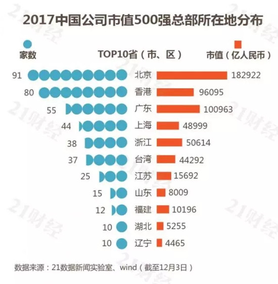 這些500強覆蓋全國109座城市,以北京、香港、上海最多,此外深圳、臺北、廣州、杭州、南京的500強數量均超過10家。