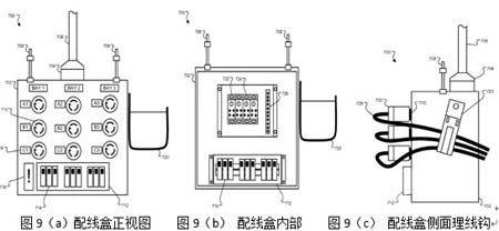 圖9(a)展示了帶9P空開(kāi)的配線盒正視圖,輸入線纜706可從母排或者配電柜取電,其線徑可選擇AWG 2號(hào)線或者載流量達(dá)到100A的線纜。配線盒面板上有9個(gè)型號(hào)為L(zhǎng)eviton L6-30R的輸出母頭和9P控制空開(kāi)。配線盒側(cè)面還有個(gè)線纜捆扎鉤720,用于輸出線纜的捆扎整理,線纜美觀的同時(shí)還能減少下垂線纜的重量對(duì)配線盒的拉伸應(yīng)力。圖9(b)則展示了配線盒內(nèi)部的配線排細(xì)節(jié),比如輸入配線排將輸入的三根火線分配到9個(gè)空開(kāi)上,還有中線排和地線排等用于9個(gè)支路的輸出,并且接地排同時(shí)還會(huì)連接到配線盒外殼上作為接地保護(hù)。圖9(c)則是配線盒的側(cè)視圖,展示了輸出線纜如何掛接在線纜鉤上,減少線纜重量對(duì)線纜輸出接頭的拉伸應(yīng)力。這種配線盒設(shè)計(jì)有效節(jié)省了機(jī)房空間,并滿(mǎn)足快速部署需求。