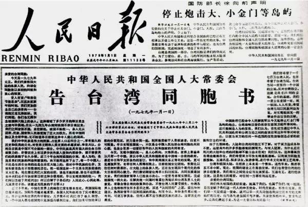 1979年元旦,全國人大常委會發(fā)表了《告臺灣同胞書》,鄭重宣示了爭取祖國和平統(tǒng)一的大政方針,明確提出了一系列發(fā)展兩岸關(guān)系、促進和平統(tǒng)一進程的政策措施。