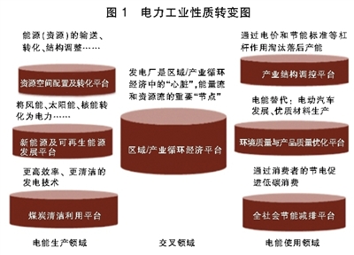 判斷2:電力工業(yè)的功能性質(zhì)已經(jīng)由傳統(tǒng)的保障國(guó)民經(jīng)濟(jì)發(fā)展及人民生活水平提高對(duì)電力供應(yīng)的量、質(zhì)要求(公用性、基礎(chǔ)性),拓展為促進(jìn)能源系統(tǒng)綠色化,進(jìn)一步成為能源工業(yè)的主體和循環(huán)經(jīng)濟(jì)的核心(見(jiàn)圖1)。