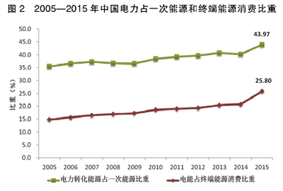 當(dāng)前我國(guó)與發(fā)達(dá)國(guó)家電能在終端能源消費(fèi)中的比重持平,且我國(guó)還略高于英國(guó)等發(fā)達(dá)國(guó)家。這種現(xiàn)象使一些專家認(rèn)為,我國(guó)電能占終端能源比重不會(huì)再提高。筆者認(rèn)為,發(fā)達(dá)國(guó)家天然氣在終端能源消費(fèi)中的比重約為25%,而我國(guó)在7%左右,我國(guó)計(jì)劃在2020年力爭(zhēng)達(dá)到10%,2030年達(dá)到15%左右。制約天然氣發(fā)展的主要因素是資源、價(jià)格以及相對(duì)于可再生能源碳排放仍然較高的特性。要提高我國(guó)終端能源消費(fèi)的清潔化,需要同步提高可再生能源發(fā)電比重及電能在終端能源消費(fèi)中的比重(見(jiàn)圖2)。