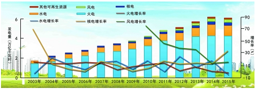 2003年至2015年各品種發(fā)電量變化