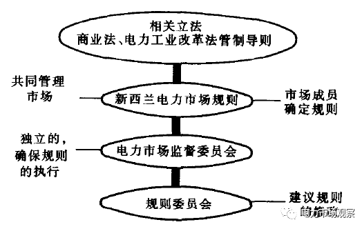 新西蘭電力批發(fā)市場(chǎng)是開(kāi)放、競(jìng)爭(zhēng)、自愿、自律的市場(chǎng)。所謂自愿,是指新西蘭電力市場(chǎng)是一個(gè)自愿加入的市場(chǎng),所有參與者并非強(qiáng)迫參與。所謂自律,是指新西蘭電力市場(chǎng)自我約束,政府并不直接管制電力市場(chǎng),也沒(méi)有專(zhuān)門(mén)的電力市場(chǎng)法。新西蘭電力市場(chǎng)監(jiān)管的組織結(jié)構(gòu)如圖1所示。