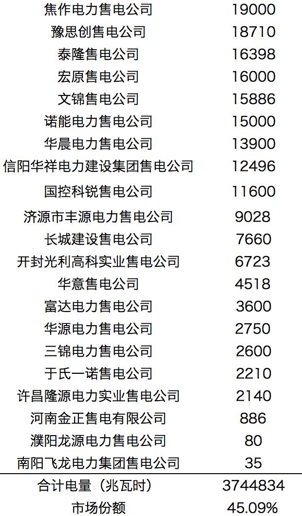 說完發(fā)電側的交易情況,再說說購電側的成交情況,這次河南八大發(fā)電集團旗下售電公司代理的電量不多只有858424兆瓦時,占比只有10.336%,較上次37.8%有較大下滑。(詳細見下圖)