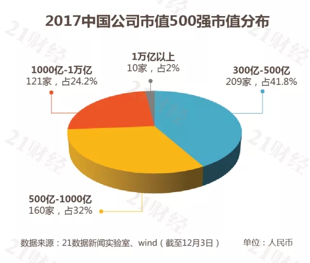 21數(shù)據(jù)新聞實(shí)驗(yàn)室選擇在上海、深圳、香港、紐約等全球15個(gè)交易所上市的所有中國(guó)公司,對(duì)它們的最新市值進(jìn)行加總換匯計(jì)算,得出“2017中國(guó)上市公司市值500強(qiáng)榜單”。
