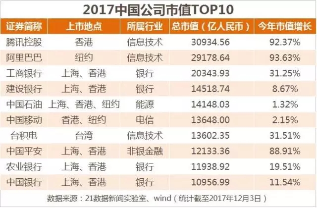 截至2017年12月1日,占據(jù)500強(qiáng)前兩位的騰訊控股、阿里巴巴總市值分別為30935億、29179億,差不多高出第三名工商銀行50%。