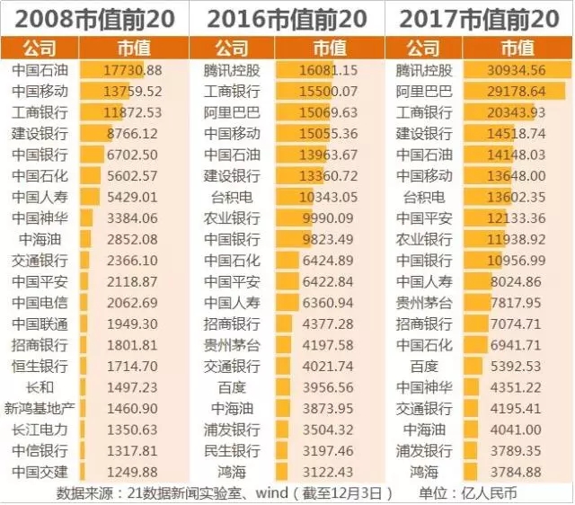值得一提的是,這也是十年來(lái)首次,互聯(lián)網(wǎng)科技公司包攬前兩名。而在2008年至2014年,中國(guó)石油一直雄踞市值榜首,占據(jù)第二名的基本是工商銀行;2015年則由工商銀行、中國(guó)移動(dòng)領(lǐng)先。