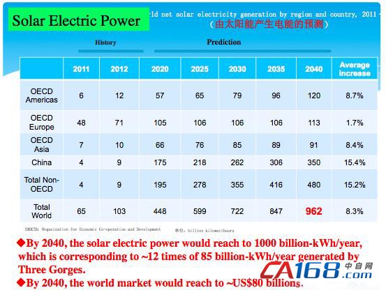 假如我們發(fā)展新能源,首先是太陽能,我們來看太陽能是什么樣的情況,這里列出的是在世界上不同范圍、不同區(qū)域從2011年到2040年太陽能產(chǎn)生電能的預(yù)測。我們可以看到到2040年,地球上的太陽能發(fā)出的電,每年有1萬億度電,相當(dāng)于三峽電站發(fā)電量的10—12倍。