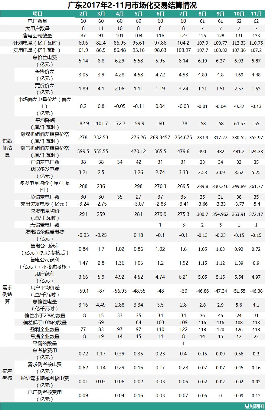 下面是晶見工作室根據(jù)廣東交易中心發(fā)布的結(jié)算通告整理的廣東2017年2-11月電力市場結(jié)算情況表: