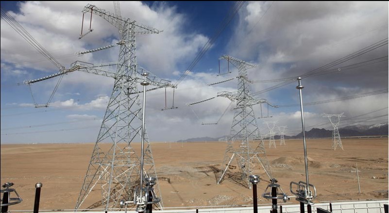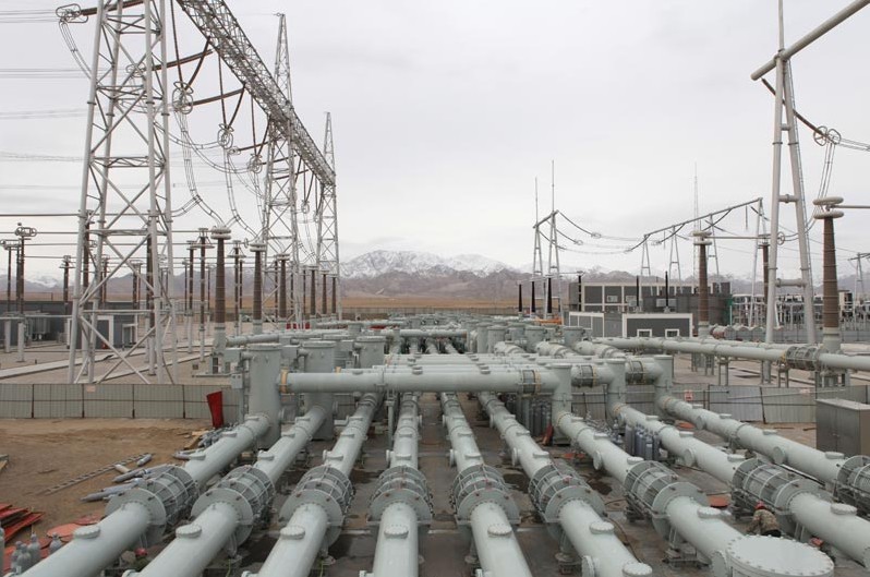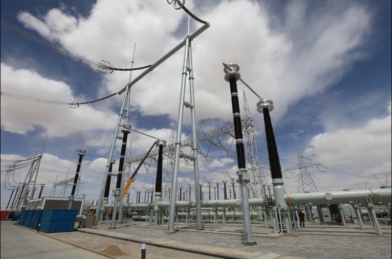 5月8日我們起了一個大早,早早地吃完早餐,拿起各自的采訪行頭,戴著安全帽,跟隨宋新民等人一同來到產(chǎn)品安裝現(xiàn)場進行實地采訪。走進施工現(xiàn)場,高高的線塔直插云霄,公司生產(chǎn)的6個間隔800千伏全封閉組合電器就像6個巨型方陣,整齊威武地屹立戈壁灘中等待著檢閱。