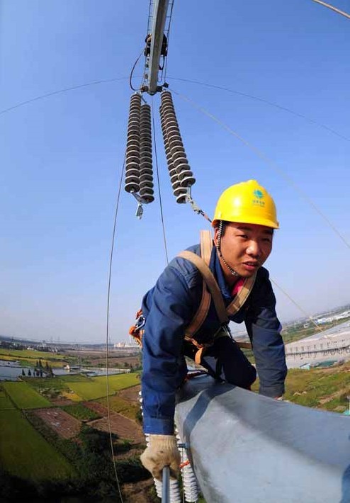 10月1日,在安徽省蕪湖市經(jīng)濟(jì)開發(fā)區(qū)境內(nèi),安徽送變電工程公司施工人員正在40米高空安裝導(dǎo)線附件。
