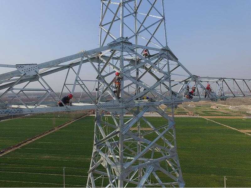 送變電工程公司技術(shù)人員在江蘇徐州銅山境的晉北-南京±800千伏特高壓直流輸電工程建設(shè)工地上組立鐵塔。