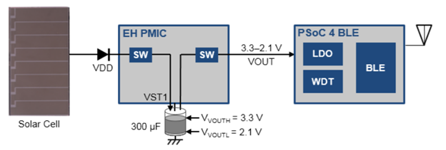 而電源管理芯片(PMIC)是用來穩(wěn)定能量收集設(shè)備所收集的能量,并需要支持其本身的超低功耗的運(yùn)行。打個(gè)比方,賽普拉斯S6AE103A PMIC 器件的電流消耗低至280 nA,啟動(dòng)功率為 1.2 uW(見圖3)。因此,在約100 lx的低亮度的環(huán)境中,依然可以從緊湊型太陽能面板獲得少量的能量。