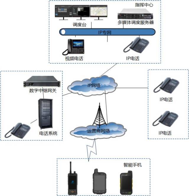 業(yè)務(wù)融合,通過不同功能的網(wǎng)關(guān),可以與行業(yè)中常用的業(yè)務(wù)系統(tǒng)對接,如與PDT/DMR/LTE專網(wǎng)系統(tǒng)、監(jiān)控系統(tǒng)、電話系統(tǒng)、廣播系統(tǒng),將不同系統(tǒng)納入統(tǒng)一平臺,實現(xiàn)公網(wǎng)專網(wǎng)統(tǒng)一調(diào)度、相互備份、高效可靠,成為專網(wǎng)的有力支撐和補充