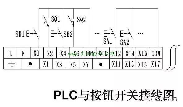 按鈕或者接近開關(guān)的接線所示:PLC開關(guān)量接線,一頭接入PLC的輸入端(X0,X1,X2等),另一頭并在一起接入PLC公共端口(COM端)。