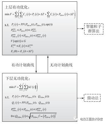 圖2中所示的優(yōu)化結(jié)構(gòu)是上下層迭代求解的過(guò)程,上層優(yōu)化決策基于預(yù)測(cè)信息確定主動(dòng)配電網(wǎng)分布式電源的有功出力計(jì)劃曲線,下層根據(jù)上層有功出力曲線以及預(yù)測(cè)信息確定主動(dòng)配電網(wǎng)分布式電 源的無(wú)功出力計(jì)劃曲線以及其他無(wú)功調(diào)節(jié)設(shè)備投切策略,反復(fù)迭代,直至上下層結(jié)果收斂或達(dá)到最大迭代次數(shù)。