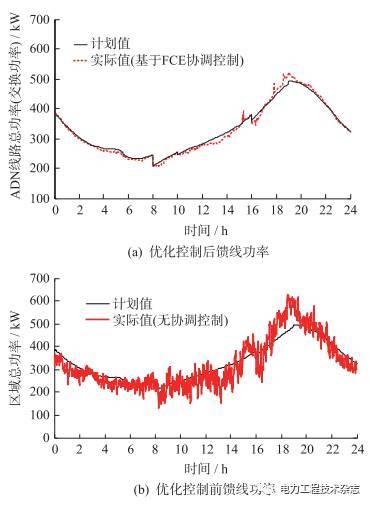 在基于FCE的協(xié)調(diào)控制系統(tǒng)下,區(qū)域總功率的實(shí)際值與計(jì)劃值如圖 6(a)所示。從與圖6(b)的比較可以看出,若無(wú)協(xié)調(diào)控制系統(tǒng),區(qū)域總功率實(shí)際值與計(jì)劃值差異較大,并且短時(shí)間波動(dòng)量較多。在基于FCE的協(xié)調(diào)控制下,分別對(duì)區(qū)域總功率偏差的波動(dòng)分量及穩(wěn)定分量進(jìn)行補(bǔ)償,使得協(xié)調(diào)控制下的總功率的實(shí)際值更接近其計(jì)劃值。