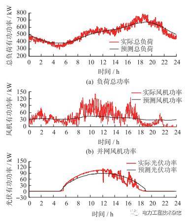 仿真算例如圖4所示。共配置11個(gè)光伏、8個(gè)儲(chǔ)能、1個(gè)風(fēng)機(jī)、2個(gè)微型燃?xì)廨啓C(jī)、28個(gè)負(fù)荷點(diǎn),其中包括4個(gè)工業(yè)負(fù)荷和24個(gè)居民負(fù) 荷、37個(gè)可控開關(guān)。以24h連續(xù)運(yùn)行為場(chǎng)景進(jìn)行仿真驗(yàn)證。對(duì)區(qū)域5進(jìn)行分析,其中,ESS11為功率密度型儲(chǔ)能系統(tǒng),其最大充放電功率為80kW,其能量容量較小,為30kW·h。負(fù)荷、風(fēng)機(jī)及光伏系統(tǒng)在24h內(nèi)每分鐘的預(yù)測(cè)功率及實(shí)際功率如圖5所示。