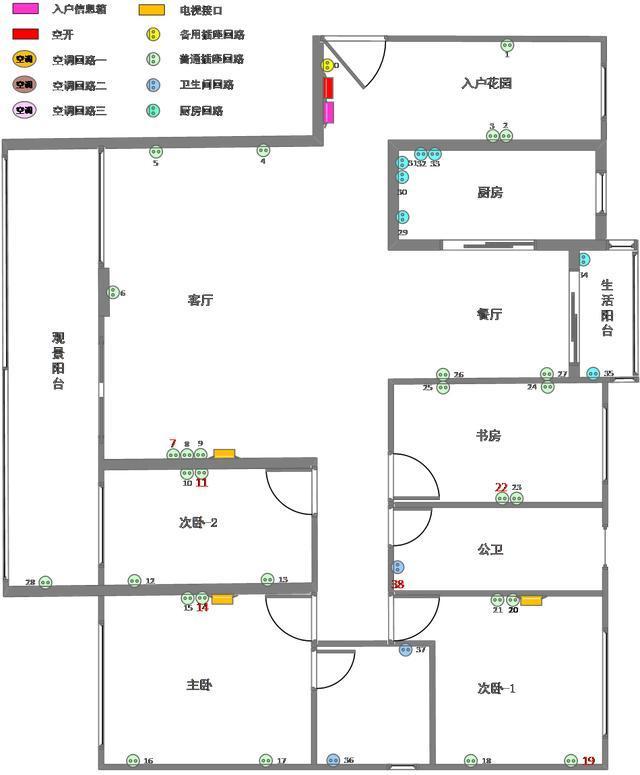 揭曉前,再普及一下回路的概念:簡單理解就是一個空氣開關(guān)(下圖黑色部分)可以控制的電路,含開關(guān)/照明、普通插座、空調(diào)插座等。下圖中空調(diào)都在各自獨立的回路中,所有照明在一個回路,插座分成了3個回路。