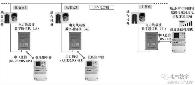 從載波機(jī)通過數(shù)據(jù)接口與從節(jié)點(diǎn)配電臺(tái)區(qū)處的集中器等終端設(shè)備相連,終端設(shè)備再通過低壓載波或RS 485總線等方式與該臺(tái)區(qū)內(nèi)的電能表相連。在主節(jié)點(diǎn)處,同樣需要使用一體化電容耦合器或卡接式電感耦合器與中壓配電線相連,并使用主載波機(jī)作為載波信號(hào)的收發(fā)和處理設(shè)備。主載波機(jī)再與配有GPRS/ CDMA無限通信模塊的載波通信管理機(jī)相連,最終實(shí)現(xiàn)與主站系統(tǒng)間的無線通信。
