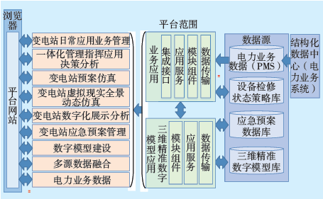 應(yīng)用層主要是指平臺(tái)用戶側(cè)的交互部分,用戶通過(guò)C/S或B/S方式訪問(wèn)系統(tǒng),調(diào)用相關(guān)操作進(jìn)行變電站三維可視化管理。主要包含數(shù)字模型管理、多源數(shù)據(jù)融合、電力業(yè)務(wù)數(shù)據(jù)、變電站數(shù)字化展示分析、變電站預(yù)案仿真、變電站虛擬現(xiàn)實(shí)全景動(dòng)態(tài)仿真、一體化管理指揮應(yīng)用決策分析、智能電網(wǎng)日常應(yīng)用業(yè)務(wù)管理等8個(gè)功能模塊,是平臺(tái)與用戶交互的窗口。