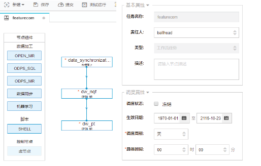 為了實(shí)現(xiàn)對(duì)監(jiān)測(cè)數(shù)據(jù)的統(tǒng)計(jì)特征計(jì)算,需要使用2個(gè)MapReduce任務(wù)來(lái)完成計(jì)算,并將計(jì)算任務(wù)串聯(lián)起來(lái)。為了完成任務(wù)串聯(lián)和任務(wù)調(diào)度的周期執(zhí)行,本文使用阿里云數(shù)加平臺(tái)的大數(shù)據(jù)開(kāi)發(fā)套件來(lái)設(shè)計(jì)實(shí)現(xiàn)計(jì)算任務(wù)的工作流,并配置任務(wù)調(diào)度策略。特征計(jì)算的工作流和調(diào)度配置界面如圖8所示。