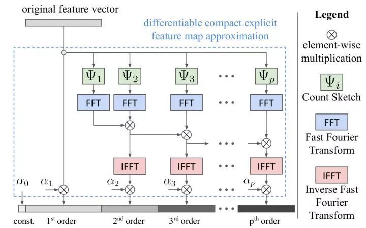 (2) 近似核估計(jì)。可以證明,在雙線性匯合結(jié)果后使用線性SVM分類等價(jià)于在描述向量間使用了多項(xiàng)式核。由于兩個(gè)向量外積的映射等于兩個(gè)向量分別映射之后再卷積,有研究工作使用隨機(jī)矩陣近似向量的映射。此外,通過(guò)近似核估計(jì),我們可以捕獲超過(guò)二階的信息(如下圖)。