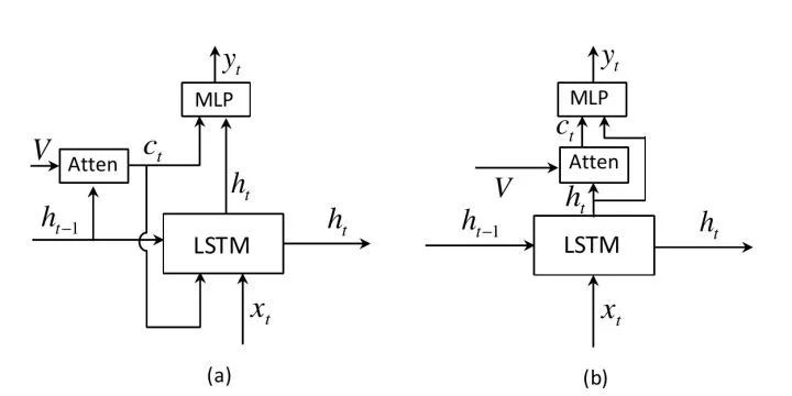 Adaptive attention 之前的注意力機(jī)制會(huì)對(duì)每個(gè)待預(yù)測(cè)詞生成一個(gè)二維注意力圖(圖(a)),但對(duì)于像the、of這樣的詞實(shí)際上并不需要借助來(lái)自圖像的線索,并且有的詞可以根據(jù)上文推測(cè)出也不需要圖像信息。該工作擴(kuò)展了LSTM,以提出“視覺(jué)哨兵”機(jī)制以判斷預(yù)測(cè)當(dāng)前詞時(shí)應(yīng)更關(guān)注上文語(yǔ)言信息還是更關(guān)注圖像信息(圖(b))。此外,和之前工作利用上一時(shí)刻的隱層狀態(tài)計(jì)算注意力圖不同,該工作使用當(dāng)前隱層狀態(tài)。