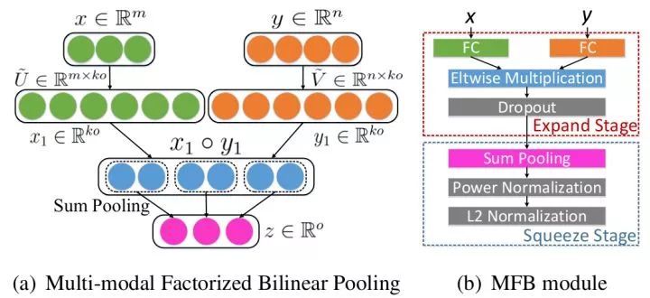 雙線性融合 通過(guò)視覺(jué)特征向量和文本特征向量的外積,可以捕獲這兩個(gè)模態(tài)特征各維之間的交互關(guān)系。為避免顯式計(jì)算高維雙線性匯合結(jié)果,細(xì)粒度識(shí)別中的精簡(jiǎn)雙線性匯合思想也可用于視覺(jué)問(wèn)答。例如,MFB采用了低秩近似思路,并同時(shí)使用了視覺(jué)和文本注意力機(jī)制。