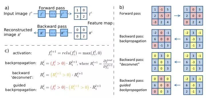 輸入顯著性圖 對(duì)給定輸入圖像,計(jì)算某一特定神經(jīng)元對(duì)輸入圖像的偏導(dǎo)數(shù)。其表達(dá)了輸入圖像不同像素對(duì)該神經(jīng)元響應(yīng)的影響,即輸入圖像的不同像素的變化會(huì)帶來(lái)怎樣的神經(jīng)元響應(yīng)值的變化。Guided backprop只反向傳播正的梯度值,即只關(guān)注對(duì)神經(jīng)元正向的影響,這會(huì)產(chǎn)生比標(biāo)準(zhǔn)反向傳播更好的可視化效果。