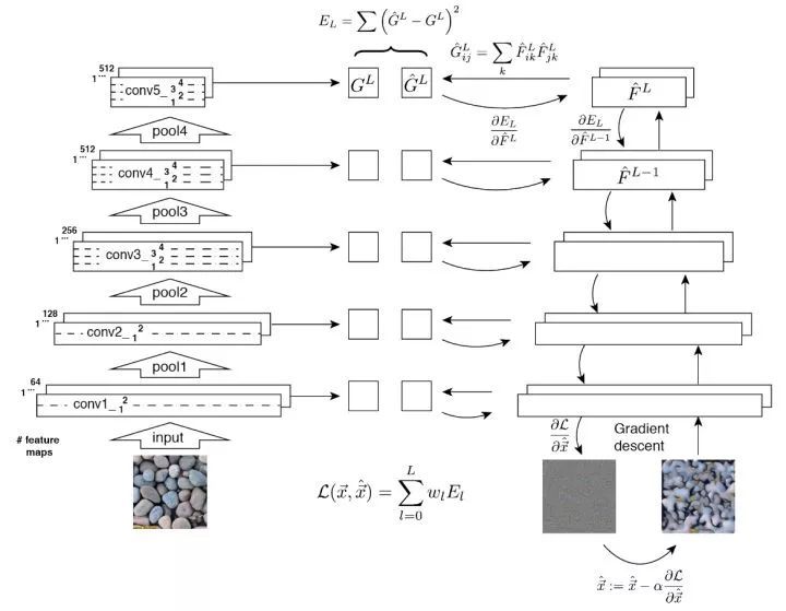 紋理生成基本思路 對(duì)給定紋理圖案的Gram矩陣進(jìn)行特征逆向工程。使生成圖像的各層特征的Gram矩陣接近給定紋理圖像的各層Gram。低層特征傾向于捕獲細(xì)節(jié)信息,而高層特征可以捕獲更大面積的特征。