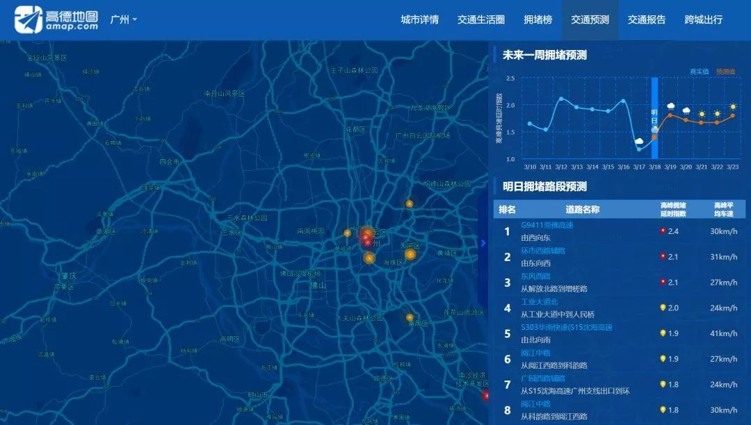 4)交通預(yù)測(cè),通過(guò)高德地圖交通大數(shù)據(jù),我們可以輕松從網(wǎng)站上面,查出我國(guó)主要城市未來(lái)一周的交通預(yù)測(cè)情況,例如選擇廣州市,廣州市未來(lái)一周的交通情況,即可通過(guò)下圖進(jìn)行了解。