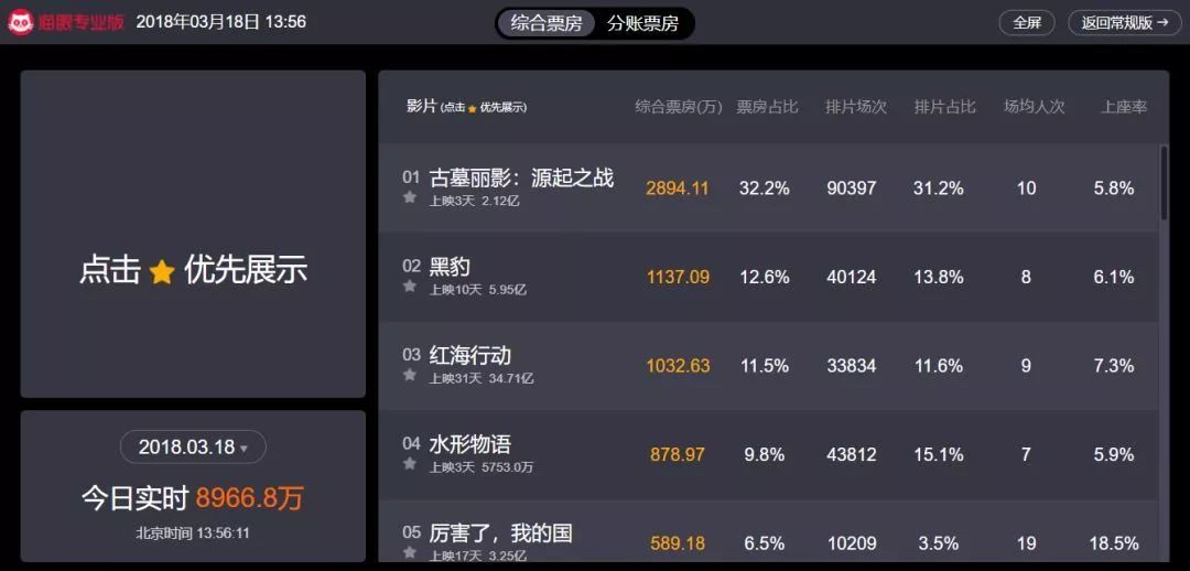 貓眼票房專業(yè)版,可以查看當(dāng)前所有播放電影的實(shí)時(shí)票房情況,如下圖所示: