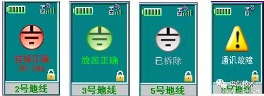 實(shí)時(shí)地線管理系統(tǒng)圖形界面如圖4所示,該界面是根據(jù)現(xiàn)場(chǎng)需求,使用戶可以直觀的查看相關(guān)變電站的地線頭狀態(tài)、電量、信號(hào)強(qiáng)度、地線使用情況、地線掛接位置等信息,同時(shí)能夠統(tǒng)計(jì)接地組數(shù),并且具有誤操作報(bào)警和歷史記錄等功能,極大的提高了地線系統(tǒng)操作的智能化管理程度。地線掛接正確、放回正確、已拆除、通訊故障如圖5地線狀態(tài)所示。