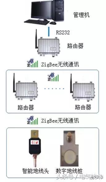 實(shí)時(shí)地線管理系統(tǒng)由地線管理主機(jī)、無(wú)線路由器、智能地線頭、智能地線樁、地線柜等組成。實(shí)時(shí)地線管理系統(tǒng)采用ZigBee無(wú)線通訊模塊和射頻檢測(cè)裝置作為地線檢測(cè)器。