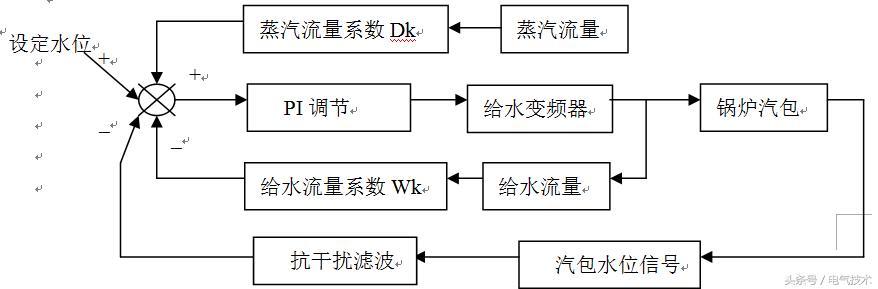 如果再設(shè)定時,保證在穩(wěn)態(tài)下D*Dk=W*Wk那么就可以得到SP=PV。此時調(diào)節(jié)器的輸出就與符合對應(yīng),變頻器輸出穩(wěn)定在某一頻率上。若有一個或多個信號發(fā)生變化,平衡狀態(tài)被破壞,PI調(diào)節(jié)模塊的輸出必將發(fā)生變化。當(dāng)水位升高了,則調(diào)節(jié)模塊的輸出信號就減小,使得給水變頻器輸出頻率減小。反之,當(dāng)水位降低時,調(diào)節(jié)模塊的輸出值增大,使變頻器輸出頻率增大。