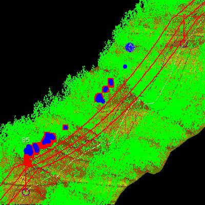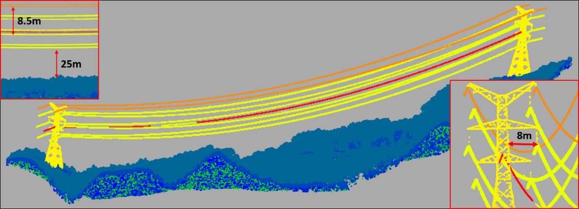 電力線走廊數(shù)字化重建后,即可得在電腦中直觀立體顯示電力線、電塔的位置、與走廊地物的空間關(guān)系;結(jié)合桿塔上安裝的溫度、濕度、風(fēng)速等監(jiān)控設(shè)備傳回的數(shù)據(jù),即可在三維數(shù)字化電網(wǎng)基礎(chǔ)上進行各種電力作業(yè)分析,如預(yù)測與模擬不同溫度、風(fēng)速、覆冰下弧垂變化情況,模擬樹木生長情況等。圖11中紅色點表示某些狀態(tài)下可能會對電力線安全構(gòu)成威脅的植被點,圖12中藍色點表示樹木在生長一段時間后可能會對電力線安全產(chǎn)生威脅的植被點(PLS-CADD)。