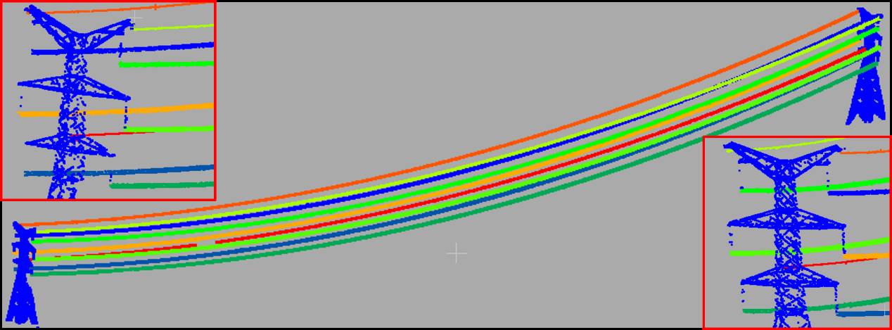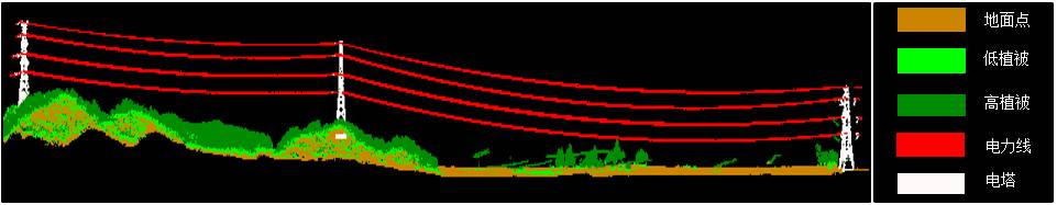該軟件主要包括四大核心模塊:電力走廊激光點云數(shù)據(jù)三維渲染模塊、點云數(shù)據(jù)分類模塊、電力線模擬分析模塊和人工交互模塊。軟件在實現(xiàn)海量電力線走廊激光點云數(shù)據(jù)三維渲染的同時,兼具電力走廊點云高效自動分類功能,目前可分六類地物(電力線、電塔、地面、低植被、高植被、建筑和道路)。電力分析模塊不僅具有電力線三維重建功能,還具有對實時工況和模擬工況的分析功能,以交跨點、危險點分析報表和電力行業(yè)橫斷面輸出為載體,助力電力巡檢行業(yè)的數(shù)字化進程。