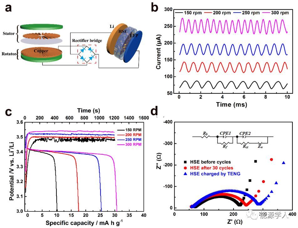 圖4. (a) 摩擦納米發(fā)電機(jī)(TENG)給固態(tài)鋰電池充電的示意圖,(b) TENG在不同轉(zhuǎn)速下的輸出電流曲線,(c) 不同轉(zhuǎn)速的TENG 給固態(tài)電池充電20min的充電曲線和電池以40μA 電流的放電曲線, (d) 不同倍率循環(huán)后的電池以及用TENG充電后電池的阻抗譜圖。