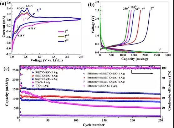 結(jié)果表明,以鎂熱還原法和溶膠凝膠法合成的具有雙層穩(wěn)定的空心Si@TiO2@C納米球負(fù)極材料,在0.2A/g的電流密度、0.01-2.5V的工作電壓下,首次放電比容量為2557.1mAh/g,庫倫效率為86.06%。在1A/g的電流密度下,250次循環(huán)后Si@TiO2@C負(fù)極材料的可逆比容量仍有1270.3mAh/g。而沒有包覆的HN-Si負(fù)極材料首次放電比容量為2264mAh/g,庫倫效率僅為67.3%。
