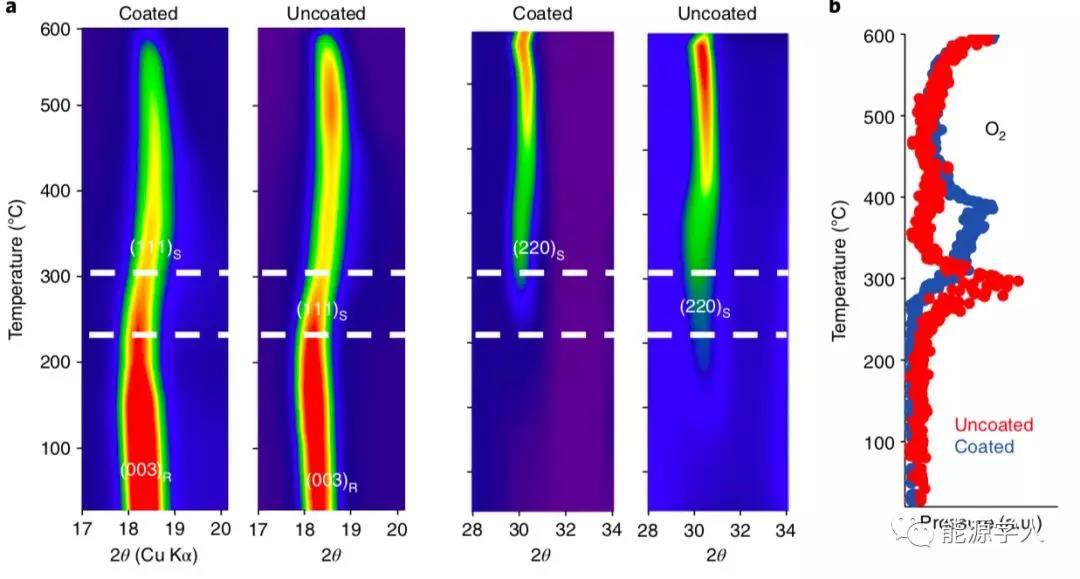 圖6.Li1.2Ni0.15Co0.1Mn0.55O2涂有和未涂有AlF3涂層之間的熱穩(wěn)定性比較。 (a)原位加熱的XRD結(jié)果(實(shí)驗(yàn)期間兩種材料均處于充電狀態(tài)),表明未涂覆的樣品比涂覆的樣品更早地經(jīng)歷相變。 R代表菱形相(R3m +),S代表尖晶石相(Fd3m),(b)在原位加熱實(shí)驗(yàn)期間兩種樣品的氧氣釋放情況,表明未涂覆的樣品釋放氧氣所需的溫度低于涂覆的。