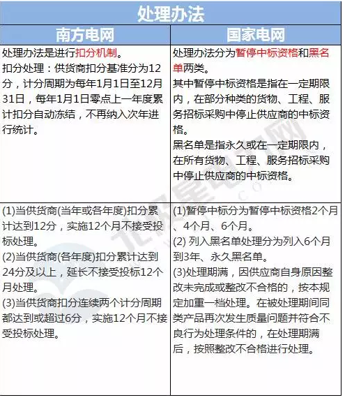 首先,在處理辦法上,南方電網(wǎng)采取的是扣分機(jī)制,基準(zhǔn)分為12分,每一年進(jìn)行一次清零,不計(jì)入下一年的統(tǒng)計(jì)中。而國家電網(wǎng)就比較“直接”一點(diǎn),處理措施分為兩大類,分別是暫停中標(biāo)資格與列入黑名單處理,視情節(jié)嚴(yán)重程度定具體執(zhí)行時(shí)間。