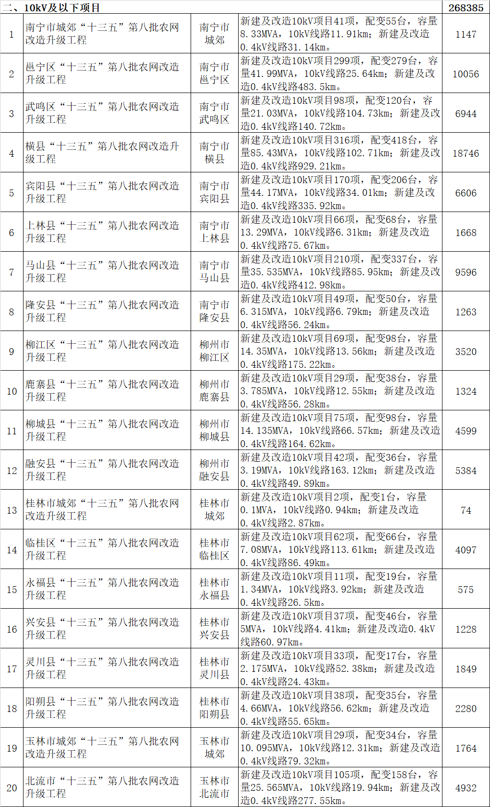 二、廣西電網(wǎng)有限責(zé)任公司“十三五”農(nóng)網(wǎng)改造升級工程項(xiàng)目(第八批)總投資估算為276795萬元,建設(shè)規(guī)模為:項(xiàng)目細(xì)項(xiàng)共5092項(xiàng),其中35kV項(xiàng)目15項(xiàng),新增及改造35千伏變電站8座,主變11臺,容量66兆伏安,35kV線路62.86公里,投資估算8410萬元;10kV項(xiàng)目5077項(xiàng),新建及改造配變6002臺,容量854.146兆伏安,10kV線路4804公里,新建及改造0.4kV線路8848公里,投資估算268385萬元。項(xiàng)目共64個(gè),涉及43個(gè)縣級供電企業(yè)和6個(gè)直供區(qū)。