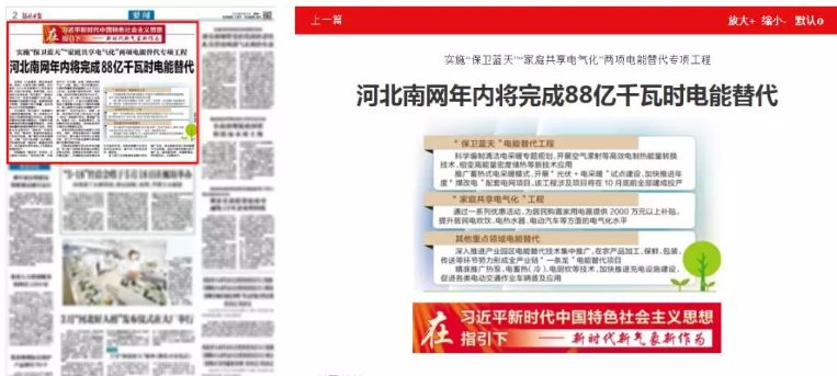 近日,河北日報刊發(fā)文章《河北南網(wǎng)年內(nèi)將完成88億千瓦時電能替代,實施保衛(wèi)藍天家庭共享電氣化兩項電能替代專項工程。發(fā)展新興技術增量,全